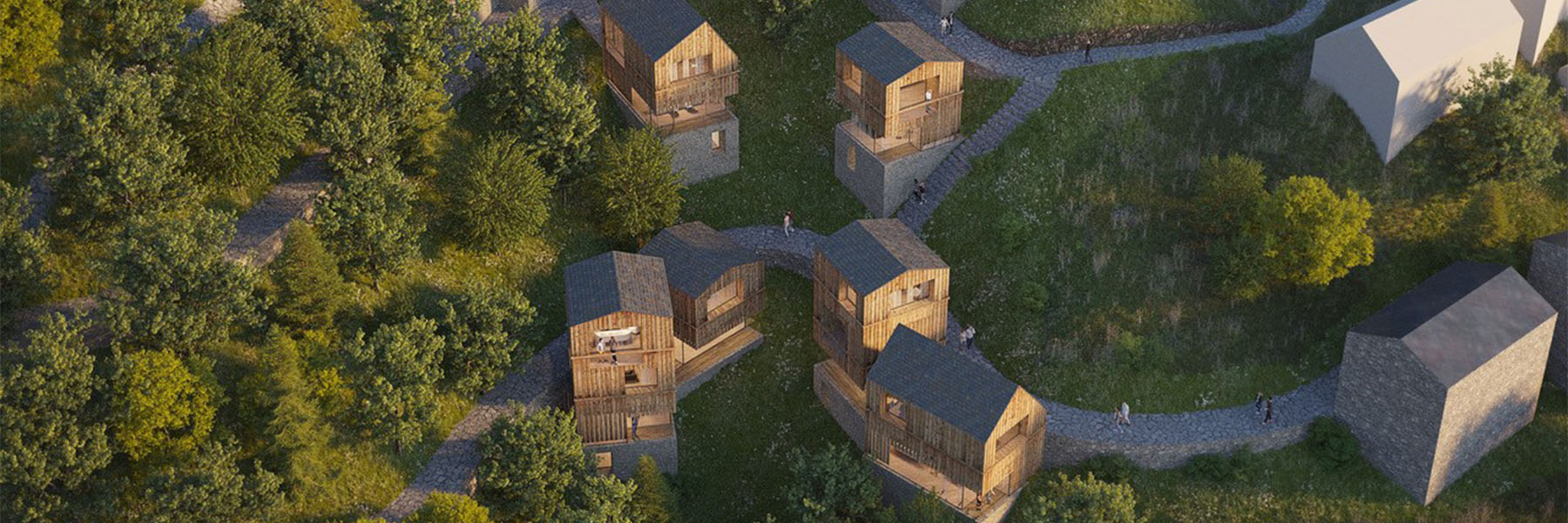 In den sonnenverwöhnten Südalpen erblüht „Cuore:NINO“ als ein neues Bergdorf, das die Seele der Landschaft einfängt. Steinmauern und Holzstrukturen schmiegen sich an steile Hänge, verbunden durch gewundene Wege.